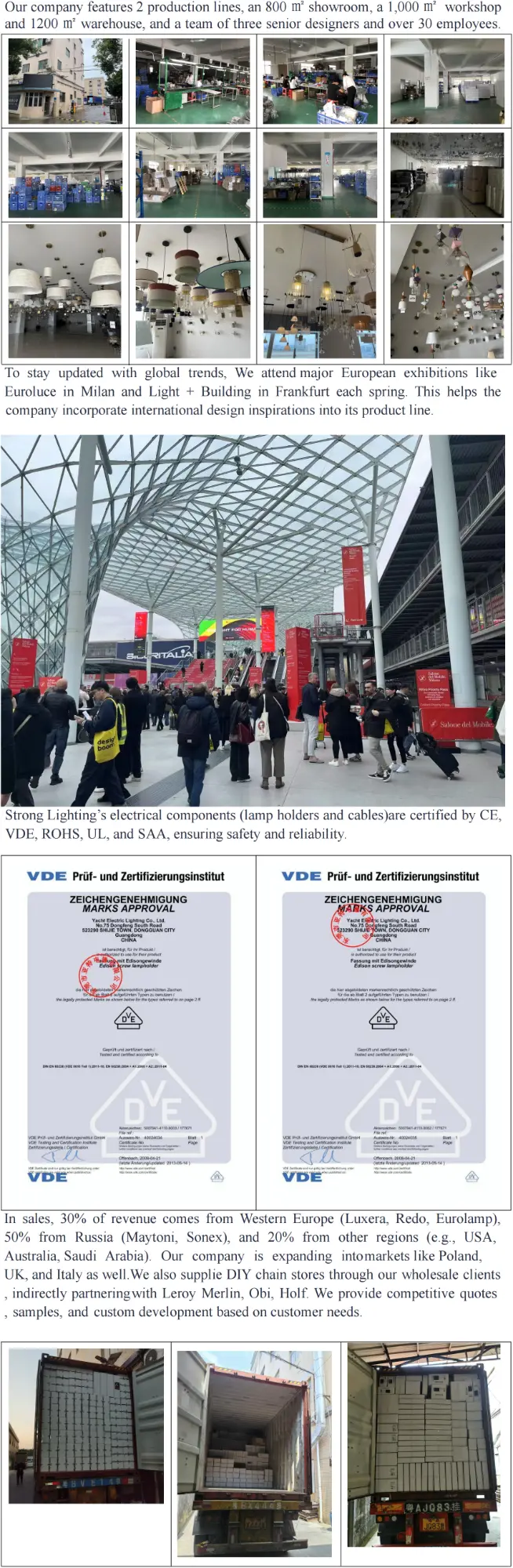 Strong Lighting, zakorenený v centre osvetlenia mesta Guzhen v meste Zhongshan, čerpá inšpiráciu z globálnych trendov na výstavách Milan Euroluce a Frankfurt Light + Building, vďaka čomu si naše návrhy udržia náskok pred krivkami odvetvia. Naša dielňa s rozlohou 1 000 ㎡ a duálne výrobné linky podporujú ročnú produkciu kontajnerov 100 x 40 HQ, čo nám umožňuje spracovávať veľké hromadné objednávky s konzistentnou kvalitou.