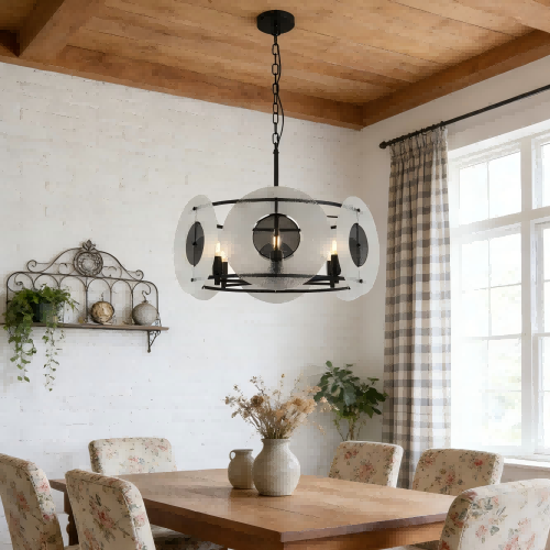 Tento matný čierny sklenený luster, vyrobený s robustným matným čiernym železným rámom, má kruhové tienidlá z cukrového skla a kovovú sieťovinu voštinového typu, čím vytvára pozoruhodnú vrstvenú estetiku, kde svetlo jemne preniká cez textúrované sklo, zatiaľ čo sieťovina dodáva priemyselný okraj.