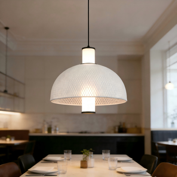 Toto minimalistické talianske závesné svietidlo z hodvábnej sieťoviny od Strong Lighting, inšpirované špičkovými dizajnovými trendmi na výstave Euroluce v Miláne 2025, dokonale spája taliansky minimalizmus s praktickou funkčnosťou. Centrálny 15W LED svetelný zdroj vyžaruje neutrálne svetlo 4000K, čím vytvára príjemnú atmosféru. S jasom 1500LM a vysokým indexom podania farieb Ra>80 je svetlo prirodzené a verné, vďaka čomu je vhodné do obývacích izieb, jedální a iných priestorov. Okrúhle tienidlo v tvare oblúka je vyrobené zo železnej sieťoviny omotanej okolo bielej hodvábnej tkaniny a matný čierny hardvér je dokončený procesom sprejovania, aby sa pridala textúra. Jednoduchý dizajn sa ľahko integruje do severských, moderných a iných domácich štýlov.