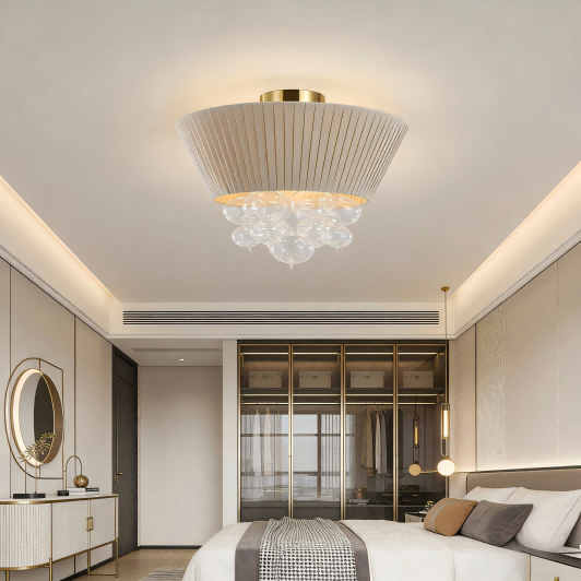 Spoločnosť Strong Lighting počas svojho dlhodobého pôsobenia na európskom a americkom trhu vždy venovala veľkú pozornosť estetickým potrebám a scenárom použitia koncových používateľov. Látkové tienidlo tohto stropného svietidla je vyrobené ručne lisovanými textúrami, ktoré vytvárajú prirodzenú a trojrozmernú skladanú textúru. Svetlo, ktoré vyžaruje, je mäkké a rovnomerne rozložené a vytvára teplé a pohodlné svetelné prostredie. Sklenené bubliny visiace dole sú ručne fúkané, každá má trochu iný tvar. Keď sa rozsvietia, vyzerajú ako zavesené svetelné korálky, ktoré predstavujú dynamický a očarujúci efekt svetla a tieňa. Či už je použitý v severskom minimalistickom obytnom priestore alebo komerčnom mieste s ľahkým luxusným štýlom, môže výrazne zvýšiť kvalitu priestoru.